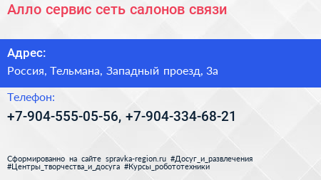Алло сервис, сеть салонов связи по адресу Семишагофф, 3А, Западный проезд, Красная Звезда, посёлок имени Свердлова, Свердловское городское поселение, Всеволожский район, Ленинградская область, Северо-Западный федеральный округ, 188683, Россия в дальнейшем Организация, размещена в следующих категориях: