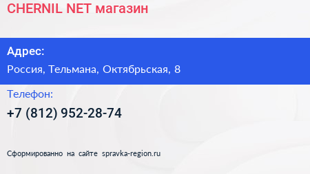 CHERNIL.NET, магазин по адресу Торговый центр «Ока», Линия Обороны, Простоквашино, Колпино, Тельмановское городское поселение, Тосненский район, Санкт-Петербург, Северо-Западный федеральный округ, 187032, Россия в дальнейшем Организация, размещена в следующих категориях: