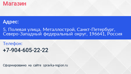 Магазин по адресу 5, Полевая улица, Металлострой, Санкт-Петербург, Северо-Западный федеральный округ, 196641, Россия в дальнейшем Организация, размещена в следующих категориях: