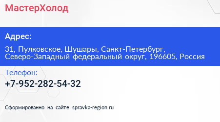МастерХолод по адресу 31, Пулковское, Шушары, Санкт-Петербург, Северо-Западный федеральный округ, 196605, Россия в дальнейшем Организация, размещена в следующих категориях:
