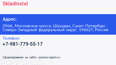 Skladinstal по адресу 296А, Московское шоссе, Шушары, Санкт-Петербург, Северо-Западный федеральный округ, 196627, Россия в дальнейшем Организация, размещена в следующих категориях: