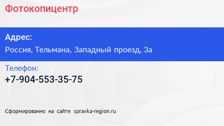 Фотокопицентр по адресу 3А, Западный проезд, Красная Звезда, посёлок имени Свердлова, Свердловское городское поселение, Всеволожский район, Ленинградская область, Северо-Западный федеральный округ, 188683, Россия в дальнейшем Организация, размещена в следующих категориях:
