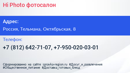 Hi Photo, фотосалон по адресу Торговый центр «Ока», Линия Обороны, Простоквашино, Колпино, Тельмановское городское поселение, Тосненский район, Санкт-Петербург, Северо-Западный федеральный округ, 187032, Россия в дальнейшем Организация, размещена в следующих категориях:
