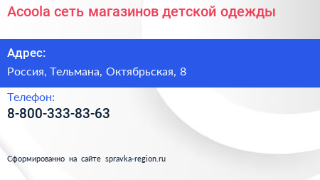 Acoola, сеть магазинов детской одежды по адресу Торговый центр «Ока», Линия Обороны, Простоквашино, Колпино, Тельмановское городское поселение, Тосненский район, Санкт-Петербург, Северо-Западный федеральный округ, 187032, Россия в дальнейшем Организация, размещена в следующих категориях: