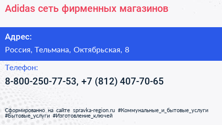 Adidas, сеть фирменных магазинов по адресу Торговый центр «Ока», Линия Обороны, Простоквашино, Колпино, Тельмановское городское поселение, Тосненский район, Санкт-Петербург, Северо-Западный федеральный округ, 187032, Россия в дальнейшем Организация, размещена в следующих категориях: