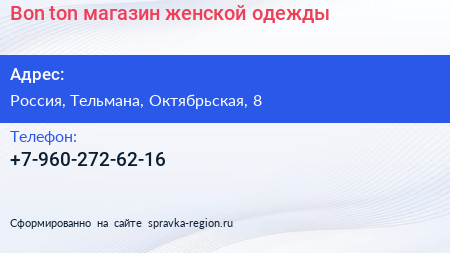 Bon ton, магазин женской одежды по адресу Торговый центр «Ока», Линия Обороны, Простоквашино, Колпино, Тельмановское городское поселение, Тосненский район, Санкт-Петербург, Северо-Западный федеральный округ, 187032, Россия в дальнейшем Организация, размещена в следующих категориях: