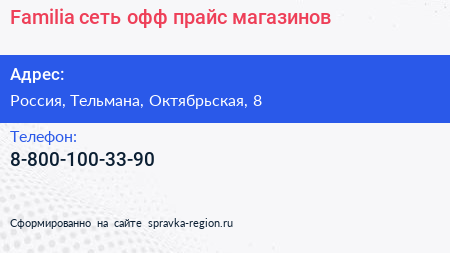 Familia, сеть офф-прайс магазинов по адресу Торговый центр «Ока», Линия Обороны, Простоквашино, Колпино, Тельмановское городское поселение, Тосненский район, Санкт-Петербург, Северо-Западный федеральный округ, 187032, Россия в дальнейшем Организация, размещена в следующих категориях: