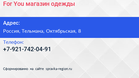 For You, магазин одежды по адресу Торговый центр «Ока», Линия Обороны, Простоквашино, Колпино, Тельмановское городское поселение, Тосненский район, Санкт-Петербург, Северо-Западный федеральный округ, 187032, Россия в дальнейшем Организация, размещена в следующих категориях: