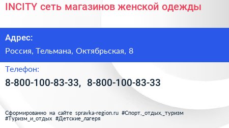 INCITY, сеть магазинов женской одежды по адресу Торговый центр «Ока», Линия Обороны, Простоквашино, Колпино, Тельмановское городское поселение, Тосненский район, Санкт-Петербург, Северо-Западный федеральный округ, 187032, Россия в дальнейшем Организация, размещена в следующих категориях: