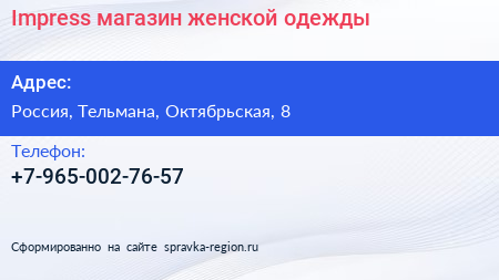 Impress, магазин женской одежды по адресу Торговый центр «Ока», Линия Обороны, Простоквашино, Колпино, Тельмановское городское поселение, Тосненский район, Санкт-Петербург, Северо-Западный федеральный округ, 187032, Россия в дальнейшем Организация, размещена в следующих категориях: