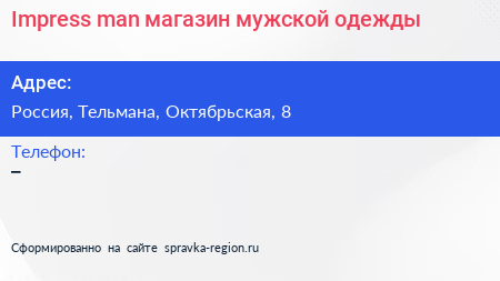Impress man, магазин мужской одежды по адресу Торговый центр «Ока», Линия Обороны, Простоквашино, Колпино, Тельмановское городское поселение, Тосненский район, Санкт-Петербург, Северо-Западный федеральный округ, 187032, Россия в дальнейшем Организация, размещена в следующих категориях: