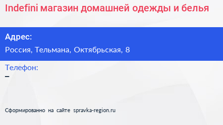 Indefini, магазин домашней одежды и белья по адресу Торговый центр «Ока», Линия Обороны, Простоквашино, Колпино, Тельмановское городское поселение, Тосненский район, Санкт-Петербург, Северо-Западный федеральный округ, 187032, Россия в дальнейшем Организация, размещена в следующих категориях:
