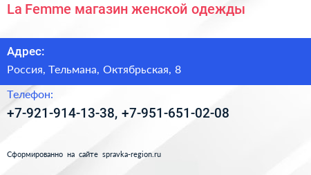 La Femme, магазин женской одежды по адресу Торговый центр «Ока», Линия Обороны, Простоквашино, Колпино, Тельмановское городское поселение, Тосненский район, Санкт-Петербург, Северо-Западный федеральный округ, 187032, Россия в дальнейшем Организация, размещена в следующих категориях: