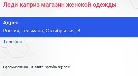 Леди каприз, магазин женской одежды по адресу Торговый центр «Ока», Линия Обороны, Простоквашино, Колпино, Тельмановское городское поселение, Тосненский район, Санкт-Петербург, Северо-Западный федеральный округ, 187032, Россия в дальнейшем Организация, размещена в следующих категориях: