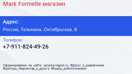 Mark Formelle, магазин по адресу Торговый центр «Ока», Линия Обороны, Простоквашино, Колпино, Тельмановское городское поселение, Тосненский район, Санкт-Петербург, Северо-Западный федеральный округ, 187032, Россия в дальнейшем Организация, размещена в следующих категориях: