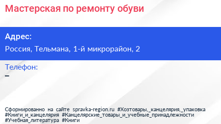 Мастерская по ремонту обуви по адресу 2, Красная Звезда, посёлок имени Свердлова, Свердловское городское поселение, Всеволожский район, Ленинградская область, Северо-Западный федеральный округ, 188683, Россия в дальнейшем Организация, размещена в следующих категориях: