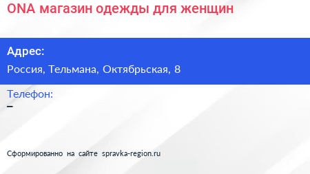 ONA, магазин одежды для женщин по адресу Торговый центр «Ока», Линия Обороны, Простоквашино, Колпино, Тельмановское городское поселение, Тосненский район, Санкт-Петербург, Северо-Западный федеральный округ, 187032, Россия в дальнейшем Организация, размещена в следующих категориях: