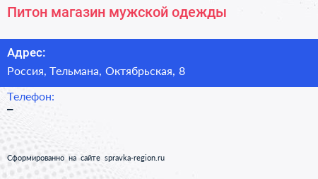 Питон, магазин мужской одежды по адресу Торговый центр «Ока», Линия Обороны, Простоквашино, Колпино, Тельмановское городское поселение, Тосненский район, Санкт-Петербург, Северо-Западный федеральный округ, 187032, Россия в дальнейшем Организация, размещена в следующих категориях:
