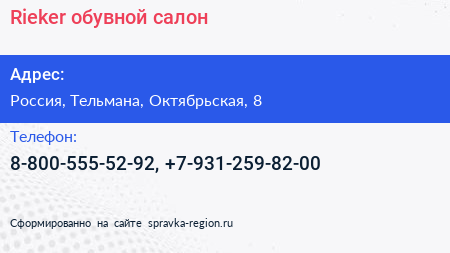 Rieker, обувной салон по адресу Торговый центр «Ока», Линия Обороны, Простоквашино, Колпино, Тельмановское городское поселение, Тосненский район, Санкт-Петербург, Северо-Западный федеральный округ, 187032, Россия в дальнейшем Организация, размещена в следующих категориях: