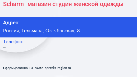 Scharm+, магазин-студия женской одежды по адресу Торговый центр «Ока», Линия Обороны, Простоквашино, Колпино, Тельмановское городское поселение, Тосненский район, Санкт-Петербург, Северо-Западный федеральный округ, 187032, Россия в дальнейшем Организация, размещена в следующих категориях: