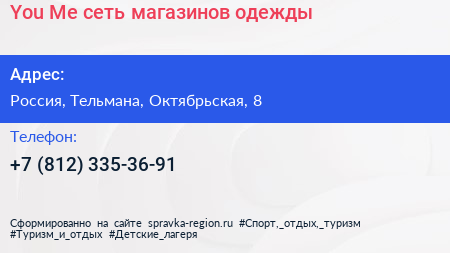 You & Me, сеть магазинов одежды по адресу Торговый центр «Ока», Линия Обороны, Простоквашино, Колпино, Тельмановское городское поселение, Тосненский район, Санкт-Петербург, Северо-Западный федеральный округ, 187032, Россия в дальнейшем Организация, размещена в следующих категориях: