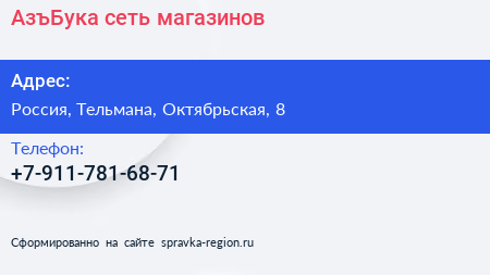 АзъБука, сеть магазинов по адресу Торговый центр «Ока», Линия Обороны, Простоквашино, Колпино, Тельмановское городское поселение, Тосненский район, Санкт-Петербург, Северо-Западный федеральный округ, 187032, Россия в дальнейшем Организация, размещена в следующих категориях: