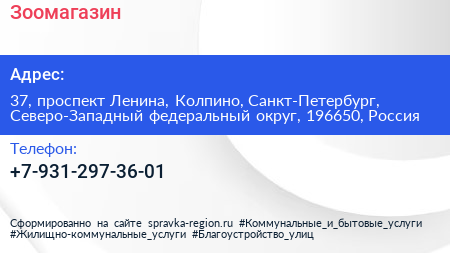 Зоомагазин по адресу 37, проспект Ленина, Колпино, Санкт-Петербург, Северо-Западный федеральный округ, 196650, Россия в дальнейшем Организация, размещена в следующих категориях: