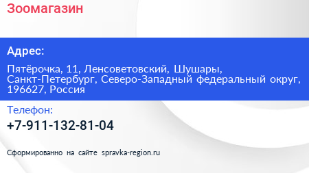 Зоомагазин по адресу Пятёрочка, 11, Ленсоветовский, Шушары, Санкт-Петербург, Северо-Западный федеральный округ, 196627, Россия в дальнейшем Организация, размещена в следующих категориях: