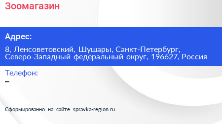Зоомагазин по адресу 8, Ленсоветовский, Шушары, Санкт-Петербург, Северо-Западный федеральный округ, 196627, Россия в дальнейшем Организация, размещена в следующих категориях: