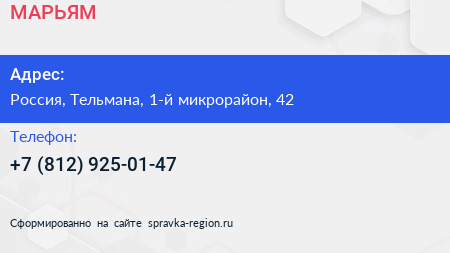 МАРЬЯМ+ по адресу 44А, Красная Звезда, посёлок имени Свердлова, Свердловское городское поселение, Всеволожский район, Ленинградская область, Северо-Западный федеральный округ, 188683, Россия в дальнейшем Организация, размещена в следующих категориях: