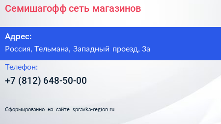 Семишагофф, сеть магазинов по адресу Семишагофф, 3А, Западный проезд, Красная Звезда, посёлок имени Свердлова, Свердловское городское поселение, Всеволожский район, Ленинградская область, Северо-Западный федеральный округ, 188683, Россия в дальнейшем Организация, размещена в следующих категориях: