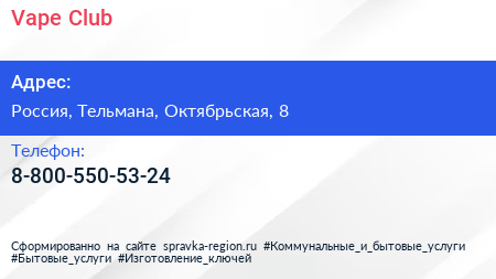 Vape Club по адресу Торговый центр «Ока», Линия Обороны, Простоквашино, Колпино, Тельмановское городское поселение, Тосненский район, Санкт-Петербург, Северо-Западный федеральный округ, 187032, Россия в дальнейшем Организация, размещена в следующих категориях: