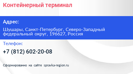Контейнерный терминал по адресу Шушары, Санкт-Петербург, Северо-Западный федеральный округ, 196627, Россия в дальнейшем Организация, размещена в следующих категориях: