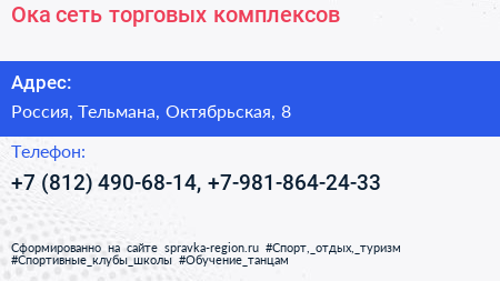 Ока, сеть торговых комплексов по адресу Торговый центр «Ока», Линия Обороны, Простоквашино, Колпино, Тельмановское городское поселение, Тосненский район, Санкт-Петербург, Северо-Западный федеральный округ, 187032, Россия в дальнейшем Организация, размещена в следующих категориях: