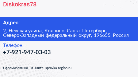 Diskokras78 по адресу 2, Невская улица, Колпино, Санкт-Петербург, Северо-Западный федеральный округ, 196655, Россия в дальнейшем Организация, размещена в следующих категориях: