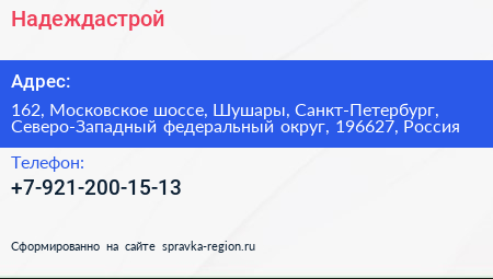 Надеждастрой по адресу 162, Московское шоссе, Шушары, Санкт-Петербург, Северо-Западный федеральный округ, 196627, Россия в дальнейшем Организация, размещена в следующих категориях: