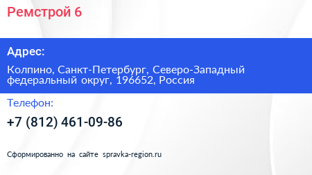 Ремстрой-6 по адресу Колпино, Санкт-Петербург, Северо-Западный федеральный округ, 196652, Россия в дальнейшем Организация, размещена в следующих категориях: