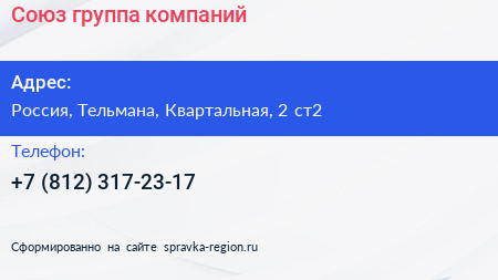 Союз, группа компаний по адресу 2, Квартальная улица, ЖК "Сибирь", Тельмановское городское поселение, Тосненский район, Ленинградская область, Северо-Западный федеральный округ, 187032, Россия в дальнейшем Организация, размещена в следующих категориях: