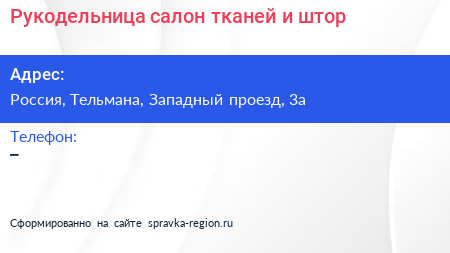 Рукодельница, салон тканей и штор по адресу 3А, Западный проезд, Красная Звезда, посёлок имени Свердлова, Свердловское городское поселение, Всеволожский район, Ленинградская область, Северо-Западный федеральный округ, 188683, Россия в дальнейшем Организация, размещена в следующих категориях: