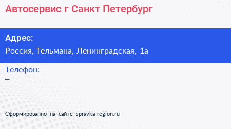Автосервис, г. Санкт-Петербург по адресу Ям, Ленинградская улица, Ям-Ижора, Тельмановское городское поселение, Тосненский район, Ленинградская область, Северо-Западный федеральный округ, 187033, Россия в дальнейшем Организация, размещена в следующих категориях: