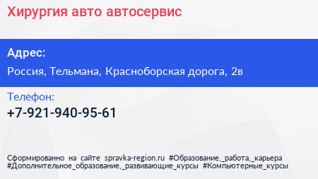 Хирургия авто, автосервис по адресу Транспортная компания Деловые Линии, 2, Красноборская дорога, Тельмановское городское поселение, Тосненский район, Ленинградская область, Северо-Западный федеральный округ, 187032, Россия в дальнейшем Организация, размещена в следующих категориях: