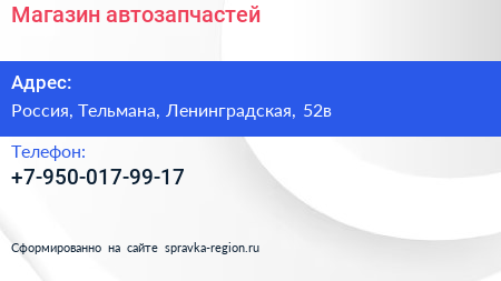 Магазин автозапчастей по адресу 52А, Ленинградская улица, Ям-Ижора, Тельмановское городское поселение, Тосненский район, Ленинградская область, Северо-Западный федеральный округ, 187033, Россия в дальнейшем Организация, размещена в следующих категориях:
