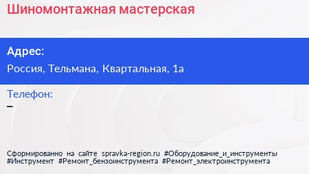 Шиномонтажная мастерская по адресу Квартальная улица, ЖК "Сибирь", Тельмановское городское поселение, Тосненский район, Ленинградская область, Северо-Западный федеральный округ, 187032, Россия в дальнейшем Организация, размещена в следующих категориях: