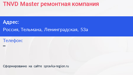 TNVD Master, ремонтная компания по адресу 51, Ленинградская улица, Ям-Ижора, Тельмановское городское поселение, Тосненский район, Ленинградская область, Северо-Западный федеральный округ, 187033, Россия в дальнейшем Организация, размещена в следующих категориях: