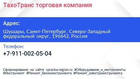 ТахоТранс, торговая компания по адресу Шушары, Санкт-Петербург, Северо-Западный федеральный округ, 196642, Россия в дальнейшем Организация, размещена в следующих категориях: