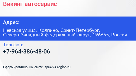 Викинг, автосервис по адресу Невская улица, Колпино, Санкт-Петербург, Северо-Западный федеральный округ, 196655, Россия в дальнейшем Организация, размещена в следующих категориях: