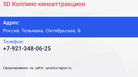 5D-Колпино, киноаттракцион по адресу Торговый центр «Ока», Линия Обороны, Простоквашино, Колпино, Тельмановское городское поселение, Тосненский район, Санкт-Петербург, Северо-Западный федеральный округ, 187032, Россия в дальнейшем Организация, размещена в следующих категориях: