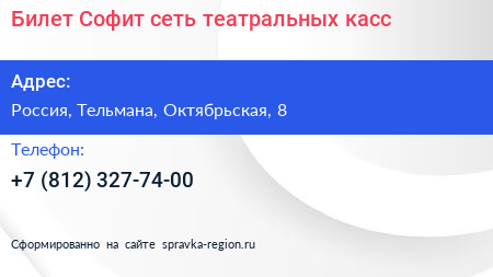 Билет Софит, сеть театральных касс по адресу Торговый центр «Ока», Линия Обороны, Простоквашино, Колпино, Тельмановское городское поселение, Тосненский район, Санкт-Петербург, Северо-Западный федеральный округ, 187032, Россия в дальнейшем Организация, размещена в следующих категориях: