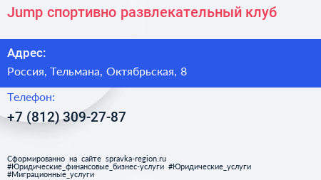 Jump, спортивно-развлекательный клуб по адресу Торговый центр «Ока», Линия Обороны, Простоквашино, Колпино, Тельмановское городское поселение, Тосненский район, Санкт-Петербург, Северо-Западный федеральный округ, 187032, Россия в дальнейшем Организация, размещена в следующих категориях: