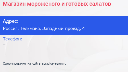 Магазин мороженого и готовых салатов по адресу 4, Западный проезд, Красная Звезда, посёлок имени Свердлова, Свердловское городское поселение, Всеволожский район, Ленинградская область, Северо-Западный федеральный округ, 188683, Россия в дальнейшем Организация, размещена в следующих категориях: